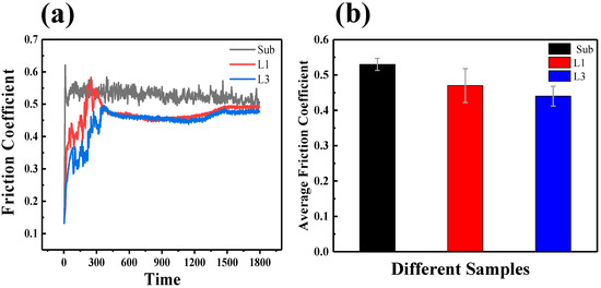 (a) Friction coefficient curves of the substrate (Sub), L1 and L3, (b) Histogram of average friction coefficient.