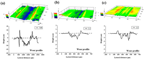 Figure 10 is the wear scar surface and the corresponding wear scar profile data obtained from the dry sliding friction and wear test. It is obvious that the wear resistance of 316L SS can be effectively improved by Ni-based alloy coating whether by single-layer cladding or multilayer cladding. Comparing Figure 10a–c, it can be found that the wear profile of the substrate surface shows more deflection. The difference in deflection depends on the difference in the contact area. Under the same load condition, the microhardness of the substrate surface is lower, which makes the contact area between the Al2O3 ceramic ball and the material surface larger. The higher the contact area, the higher the length of wear track and peak/valley heights, which in turn increases the wear rate of the material. At the same time, due to the lower microhardness of the substrate, greater deformation occurs during sliding friction, and obvious protrusions appear on both sides of the wear scar. In Figure 10b,c, samples L1 and L3 have similar 3D morphologies and the profiles of wear marks, indicating that the wear extent of L1 and L3 in dry sliding friction and wear test is similar. In addition, the relatively flat wear surface of samples L1 and L3 demonstrating that the higher microhardness of the coating surface makes the load applied to the coating be effectively distributed to the whole wear surface.