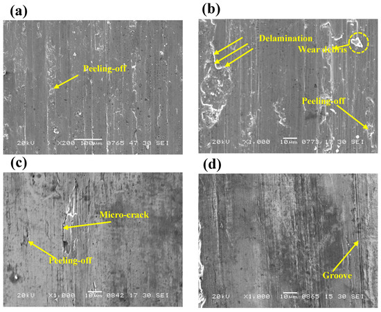 Figure 11 shows the SEM image of the morphologies of the substrate and the coatings after the dry sliding friction and wear test. Figure 11a,b are the wear SEM morphologies of the substrate. It can be seen that the wear surface is rough and uneven, and the particles peel off obviously, showing typical abrasive wear characteristics. As shown in Figure 11a, the substrate surface shows a high wear extent with some pores generated during sample preparation exposed. The surface in Figure 11b is even seriously worn, with large wear debris particles attached to it as well as many deep grooves in the area with severe particle spalling. Under a load of 10 N, particles frequently fall off from the surface, causing delamination on the wear surface, so as to greatly increase the wear rate. As seen in Figure 11c,d, the wear surfaces of the coatings are in good condition with few particles peeling off or delamination, and the coatings show excellent wear resistance. After an 1800 s sliding friction, some peeling-off appears on the surface of sample L1. At the same time, a small number of black patches appeared in Figure 11c, indicating that the wear mechanism of the L1 sample is a combination of abrasive wear and adhesive wear. In the figure, there are even obvious micro-cracks in the area where the spalling phenomenon is more serious. If the load or wear time continues to increase, the micro-cracks will expand and delamination will occur [41]. A large area of black patches can be seen in Figure 11d. During sliding friction, the particles will be transferred from the contact material. Because of the high hardness of the coating, the particles eventually appear in the form of patches, resulting in adhesive wear. Moreover, a large number of small pits in the middle of the patches indicate slight abrasive wear. Sometimes, the particles adhering to the contact surface will fill the gap (as shown in Figure 11d) during sliding, thus reducing the wear extent of the coating, but it won’t affect the wear mechanism [42]. In the process of sliding friction, the positive pressure between the load and the tangential motion of Al2O3 ceramic ball causes plastic deformation of the material, resulting in shallow grooves along the sliding direction. In addition, the fine surface structure of the L3 coating can effectively improve the wear resistance of the coating, and there is no obvious particle spalling trace except slight wear marks. In general, no matter by single-layer cladding or by multi-layer cladding, nickel-based coatings change the wear mechanism of materials in the process of friction and wear, effectively reduce the abrasive wear extent and improve the wear resistance of materials; the three-layer nickel-based coating displays the best wear resistance.
