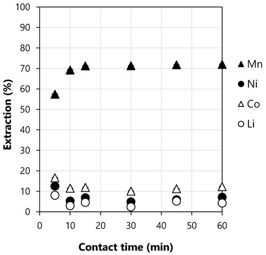 Preliminary tests were performed to determine the best conditions to be further investigated in the factorial design of experiments. The extraction of Mn, Ni, Co, and Li at different contact times can be observed in Figure 1. The mechanism of extraction of manganese using D2HEPA is very fast. The extraction of Mn was about 60% after only 5 min of contact time, and after 10 min, the extraction achieves the maximum values (approximately 70%). The coextraction of Co, Ni, and Li is slightly higher after 5 min of contact time, but it is still lower than 20%. At 10 min of contact time, the increase in the extraction of Mn resulted in a decrease of the coextraction of the other metals. The coextraction of Co, Ni, and Li after 10 min of contact time was around 11, 5, and 3%, respectively. This is in accordance with the results reported in the literature. Chen et al. [24] studied the extraction of manganese from the leaching liquor of spent LIBs using cobalt-loaded D2EHPA, and they reported that the equilibrium was achieved after only 3 min. Hossain et al. [28] also observed that the kinetics of the manganese extraction using Co-D2EHPA was fast, and the equilibrium was achieved in 5 min. Thus, low contact times are required for the extraction of manganese.