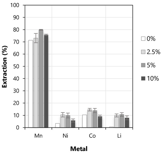 Preliminary tests using TBP (tributyl phosphate, Sigma Aldrich, Germany) as a modifier were performed to evaluate its potential to increase the extraction of manganese as well as its separation from the other metals. The extraction of Mn, Ni, Co, and Li without using TBP and when volumetric concentrations of 2.5%, 5%, and 10% TBP were used can be seen in Figure 2, where the error bars represent the standard deviation of triplicates. The extraction of Mn had a slight increase when the concentration of TBP was increased until 5%. However, the coextraction of all other metals also increased when TBP was used as a modifier. For all evaluated metals, the extraction decreased when 10% of TBP was used. Considering that no formation of a third phase was observed, it was decided not to use TBP in the next tests.