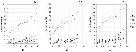 The extraction of Mn, Co, Li, and Ni for three different molar concentrations of D2HEPA (0.4, 0.5, and 0.6 M) at different pH values can be seen in Figure 3. Some tests were performed using 0.2 M D2EHPA, but in this case, the extraction of manganese never exceeded 30%, and since this concentration is lower than the ones usually reported in the literature, further tests using 0.2 M D2EHPA were not performed. The initial pH of the synthetic solution based on the composition of the LIBs leach liquor was 3.8. After contacting the synthetic solution with the extractant, the pH of the aqueous phase decreased to about 2. This behavior was expected, considering the mechanism of extraction of metals using D2EHPA (Equation (4)) described by Zhang and Cheng [14], which results in a decrease in the pH.