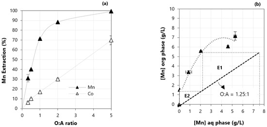 (a) Extraction of manganese and cobalt using different O:A ratios and (b) McCabe–Thiele diagram of the Mn extraction. Conditions: equilibrium pH of 3.5, 0.5 M D2EHPA, contact time of 10 min. Error bars represent the standard deviation of triplicates.