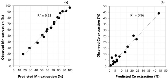 Responses predicted by the model versus experimentally observed: (a) manganese extraction and (b) cobalt extraction.