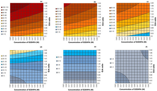 Contour plots representing the (a–c) extraction of manganese and the (d–f) coextraction of cobalt when the pH was set at 2.5 (a,d), at pH of 3.25 (b,e) and at pH 4 (c,f).