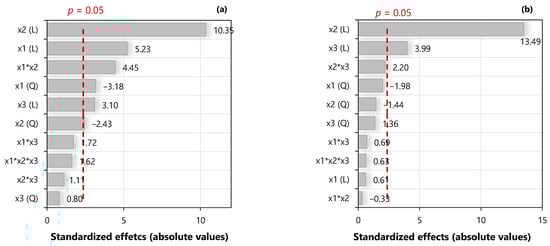 Pareto charts of the absolute values of the standardized effects of the factors for the regression model for (a) manganese extraction and (b) cobalt extraction with a significance level α = 0.05. Legend: x1: pH, x2: O:A ratio, x3: molar concentration of D2EHPA, (Q): quadratic terms, (L): linear terms.