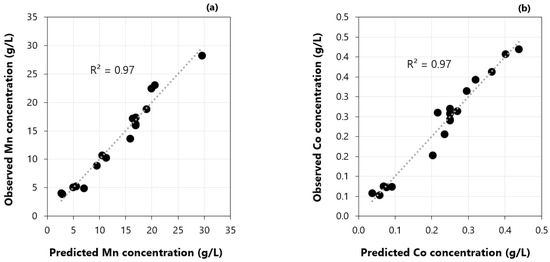 Both models presented an R2 = 0.97, which is indicative that a large proportion of the variance of the response can be explained by the independent variables, considering the range of values tested in the experiments. The relation between the experimentally observed responses and those obtained using the fitted model for the stripping of manganese and cobalt are represented in Figure 9a,b, respectively, which illustrates how the models provide a good fit to the experimental results.