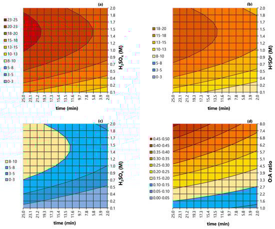 The contour plots in Figure 10a–c represent the response surfaces of the manganese stripping when the factor x2 (O:A ratio) was set at its low level (−1, O:A = 1:1), standard level (0, O:A = 4.5:1), and high level (+1, O:A = 8:1), respectively. The stripping of cobalt for different combinations of O:A ratio and time is represented by the contour plots in Figure 10d, given that the concentration of sulfuric acid did not have a significant effect on it. The values of the response (y) are represented by legends on the left side of each graph. Results are only valid in the range of values considered in this study. The concentrations of metals remaining in the organic phase and in the stripping product for each test are reported in the Supplementary Materials (Table S3).