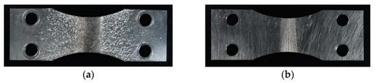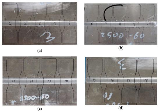 Friction stir welded (FSWed) aluminum alloy AA5754 sheets for fatigue test specimens. The black line indicates the shape of the test specimen. (a,b): Rotational speed ω was 2500 rpm, and transverse speed v was 60 mm/min. (c,d): Rotational speed ω was 1500 rpm, and transverse speed v was 60 mm/min.