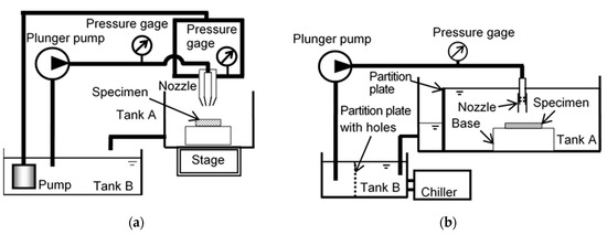 Figure 3 illustrates the cavitation peening system using (a) cavitating jet in air (CJA) and (b) cavitating jet in water (CJW). In the case of CJA, a high-speed water jet was pressurized by a plunger pump, and it was injected into a low-speed water jet, which was pressurized by a submerged turbine pump, using a concentric nozzle. In the present experiment, the CJA’s conditions were as follows, considering results of the previous reports [52,56]. The throat diameter of the nozzle for the high-speed water was 1 mm; the inner diameter for the low-speed water was 30 mm; the injection pressures of the high-speed water jet and the low-speed water jet were 20 MPa and 0.05 MPa, respectively; the standoff distance from the nozzle to the target was 56 mm. The scanning time per unit length, tp, was defined by the following equation: