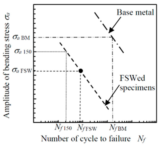 Fatigue properties of FSWed AA5754 were evaluated using a Schenk-type displacement-controlled plane-bending fatigue test. [59]. The span length at fixed point was 65 mm as shown in Figure 2. The test frequency was 12 Hz. As the displacement-controlled fatigue tester (Tokyo Koki Co. Ltd., Tokyo, Japan) was used, the amplitude of bending stress could not be fixed exactly, and the number of cycles of FSWed specimen Nf 150 at σa = 150 MPa was obtained by the following procedure. Note that S-N line of base metal and FSWed specimen were straight at σa = 150 MPa as mentioned later. Then, σa = 150 MPa was chosen to discuss the fatigue life at the present experiment. It was assumed that the S–N curve for low-cycle-fatigue base metal (BM) specimens is described by Equation (4) and that that for FSWed specimens is described by Equation (5), where c1, c2, and c3 are constants. Namely, these curves are parallel to each other, as shown in Figure 4.