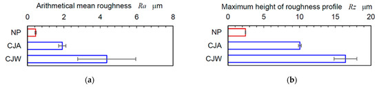 Surface roughness of cavitation-peened specimens by cavitating jet in air (CJA) and cavitating jet in water (CJW) comparing with non-peened specimen NP. (a) Arithmetical mean roughness. (b) Maximum height of roughness profile.