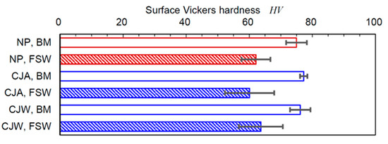 In order to investigate the work-hardening effect of FSW by cavitation peening, Figure 8 illustrates the surface Vickers hardness HV of base metal (BM) part and FSWed part treated by CJA and CJW comparing with NP. The ω at FSW was 1500 rpm. Whereas the standard deviation was considerably large, the average value of the surface Vickers hardness at the BM part was slightly increased by cavitation peening. The surface Vickers hardness at the FSWed part for all three cases was decreased compared with that of the BM part. A significant work hardening effect was not observed in the present condition.
