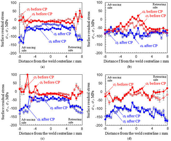 Surface residual stress of FSWed AA5754 before and after cavitation peening (CP) measured by the 2D method of X-ray diffraction. (a) The welded side of FSW by ω = 1500 rpm. (b) Root side of FSW by ω = 1500 rpm. (c) Welded side of FSW by ω = 2500 rpm. (d) Root side of FSW by ω = 2500 rpm.