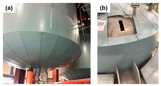 (a) Photographs of polyvinyl chloride (PVC) stabilizer reactors. (b) Top part of the reactor was the cutoff. Even though it is not shown in this image, the bottom part of the reactor cutoff was the same way as the failure analysis.