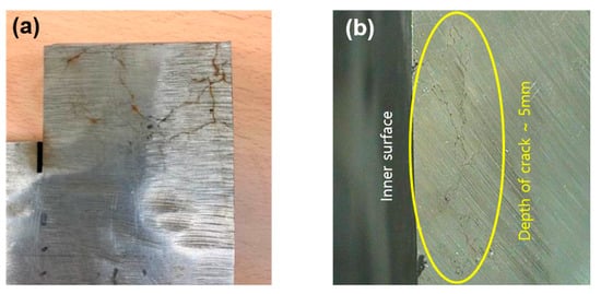 (a) Photographs of the cutoff sample and (b) photographs of the cross section of the cutoff sample. Depth of the crack from the inner surface was approximately 5 mm, of wall thickness.