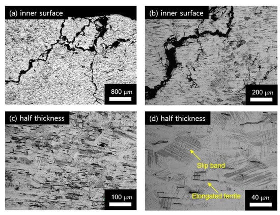 (a) The microstructure obtained from bottom part of the AISI 304 reactor, which is cold formed. (a) Low magnification of the inner surface region. (b) Higher magnification image of the region in (a) shows the high density of slip bands within grains and the morphology of the crack is step-wise. (c) The microstructure of the half thickness region of the cold formed reactor and (d) enlarged image of (c), which exhibited a high density of slip bands and elongated ferrite.