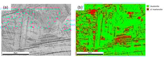The hardness value of the cold formed reactor was determined to be about 100 HRB, which is 10% higher than that of the maximum value from the material certificate. The cause of the higher hardness was expected to be work hardening due to the cold forming process. In addition, martensitic transformation could contribute to hardening the material. It is well known that the stacking fault energy of AISI 304 stainless steel is relatively low among austenitic stainless steel and lead strain induced or stress assisted martensitic transformation occurs easily for this steel []. To measure a fraction of the martensite phase and observe the distribution of martensite, EBSD analysis was conducted. Figure 4 exhibits the results of EBSD analysis obtained from the middle thickness region of the cold formed reactor. Similar to optical microscopic observation, the slip bands with high density were formed. A relatively dark area in the quality image shown in Figure 4a corresponded to the α′ martensite phases obtained in the phase map. Approximately 20% of the α′ martensite phases were formed along the slip bands within the grains. On the other hand, no martensite phase was observed at the grain boundaries.