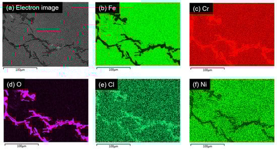 Elemental distribution maps obtained from the cracked area. From top left to bottom right, secondary electron image (a), elemental distribution maps of (b) Fe, (c) Cr, (d) O, (e) Cl, and (f) Ni. The gap generated by the crack is filled with Cr-rich oxide and the Cl element is also enriched at the oxide region.