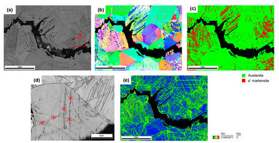 Figure 6 shows that the type of crack is transgranular. The image quality map exhibits the main crack and branches outgrow along slip bands or α’ martensite phase. The main crack propagates thorough austenitic grains as shown in the orientation map (Figure 6b). According to the result of the phase map in Figure 6c, the fraction of α′ martensite was approximately 10% in this cracked region. Additionally, there was a clear tendency that α′ martensite phases were nucleated along the slip bands. In details, branched cracks around the main crack seemed to be parallel to the slip bands and it was straightforward within grains. The main crack was also straightforward within grains and changed direction where it crossed the grain boundaries. It is expected that the crack propagates along either the slip bands or α′ martensite phase. As is well known in the fcc crystal system, slip bands formed along {111} of austenite as shown in Figure 6d. Figure 6e shows the result of the kernel average misorientation (KAM) map. KAM provides information on lattice distortion and localized deformation and a high KAM value indicates high density dislocation []. In accordance with the KAM map, the local misorientation indicated by the green to red region corresponds to the geometrically necessary dislocations (GND) induced by the martensitic formation. It seems that high density dislocation generated by the phase transformation contributes to the occurrence of SCC. Recently, it has been reported that high local misorientation is one of the possible sites for the initiation of cracking [,], which corresponded to the present experimental results.