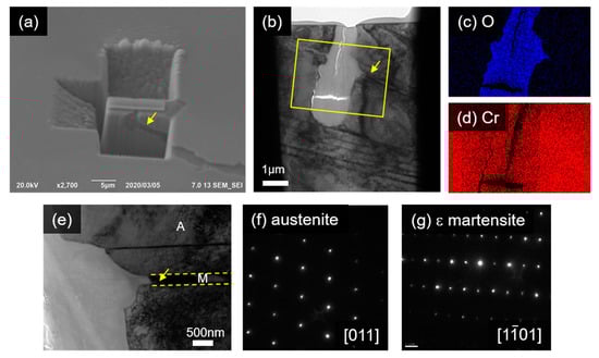 Additionally, TEM analysis was conducted to obtain detailed information of the crack propagation. Figure 7 illustrates the microstructure of the tip of the micro crack. To prepare a specimen containing the tip of the micro crack, the area with a branched crack was selected, as shown in Figure 7a. Cr-rich oxide was observed and it seems the crack propagation was hindered by facing a micro twin, which is normal for the crack growth direction. Figure 7f,g shows the electron diffraction pattern obtained from the region denoted by A and M in Figure 7e, respectively. Since the width of the band was smaller than the selected area aperture, the nano beam diffraction mode was utilized with a 1 nm beam size. The region denoted by the yellow arrow and dotted lines in Figure 7e was determined to be an ε martensite phase. It is presumed that the direction of crack propagation changed to the ε martensite phase. Although the crack width narrowed during milling by FIB, altered crack path is clearly shown in Figure 7a as denoted by the yellow arrow. The ε martensite phase is known to be an intermediate phase between austenite and α′ martensite [] and it is able to form considering that the low SFE (stacking fault energy) of AISI 304 stainless steel and cold forming process possess both strain and stress assisted martensitic transformation. However, it was confirmed that most of the martensite phase was an α′ martensite phase based on the previous result of EBSD analysis. It seems that the region with ε martensite was coincidentally selected for the TEM foil.