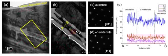 To check how the crack propagated in the area with the α’ martensite phase, an additional TEM sample was prepared, as shown in Figure 8. It can be clearly seen that oxide as a corrosion product formed parallel to the slip bands. Figure 8b illustrates the detailed microstructure of the corroded area. There were some regions not yet dissolved, as denoted with “c” in Figure 8b and it was confirmed as the austenite phase by interpreting the nano beam electron diffraction pattern shown in Figure 8c. Fortunately, we found some residue that had not corroded yet on the corrosion product and is indicated with “d” in Figure 8b. The indexing result from the electron diffraction pattern shown in Figure 8d confirms that it was α′ martensite. Based on the result of detailed microstructure analysis, the main path of crack propagation is confirmed to be α′ martensite. The chemical composition of the austenite and α’ martensite phase were measured along the interface between austenite and α′ martensite, as shown in Figure 8e. There was no distinctive difference in the chemical composition between the two phases. Considering negligible compositional difference, the main driving force of crack propagation is thought to be local strain induced by phase transformation. Figure 9 shows the magnified EBSD analyses of branch cracks in Figure 6a. Dark areas in all maps are considered to be cracks due to no signals of the Kikuchi patterns. Focused branched cracks are indicated as white arrows in Figure 9b–d, which were not fully opened yet, but about to be propagated. Comparing the phase map and KAM, we could reconfirm that the path for crack corresponded to high local strain region where small α’ martensite phases were formed.