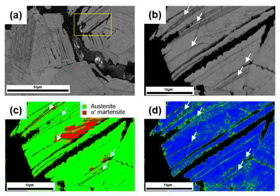 (a) Image quality map cropped in Figure 6a, (b–d) image quality map and phase map and KAM obtained from yellow rectangle in (a), respectively, and white arrows indicate branched cracks.