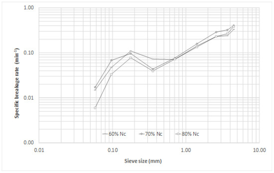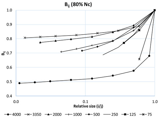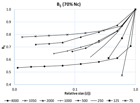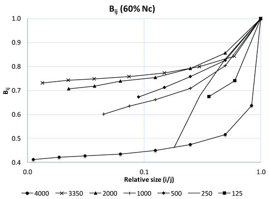 Figure 4, Figure 5 and Figure 6 and Table 5 show that Bij depends on the feed grain size for parameters of 60%, 70%, and 80% of critical speed. The influence that mill speed exerts on Bij, can also be noticed by comparing the different monosizes: a greater difference existed for coarser sizes, whereas it was lesser for finer sizes. This was due to the fact that coarse sizes not only possessed a higher Si, but also were more prone to yield new finer particles (progeny). That meant that Bij depended on the feed particle size, as Ipek and Goktepe [32] observed, which was also influenced by the mill speed, and concurred with results by Deniz [22]. Nevertheless, this variation was not as significant as reported by Austin et al. [25].