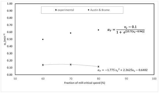 Table 4 shows that the parameter α is coherent with what Austin et al. [25] reported. These authors pointed out that it usually ranges between 0.5 and 1.5 and that it depends only on the mineral. On the other side, Table 4 and Figure 3 show that the value of the selection function αT does not vary significantly despite the increasing speed, because the mill geometry remains unchanged. Figure 4 displays αT values calculated from Equation (9), as proposed by Austin and Brame [28]. It can be seen that this expression does not fit this case. This led to a polynomial adjustment using the experiment values, as it was shown in Equation (11) that it fitted better with the studied sample.