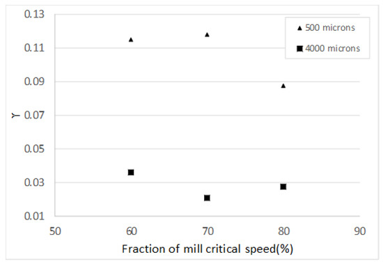 Table 5 shows parameter γ, which represents the fineness factor. In Figure 7, the γ values are plotted against mill speed for two feed particle sizes (4000 and 500 µm, respectively).