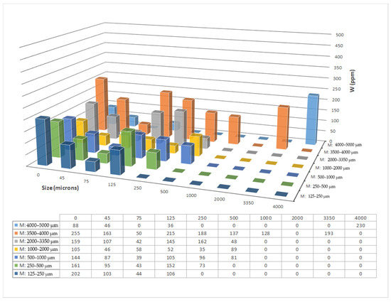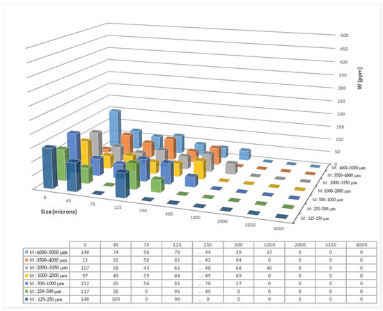 F80 for the Barruecopardo sample is 1690 µm. Table 2 shows W contents obtained from a mineralogical study for each size interval.