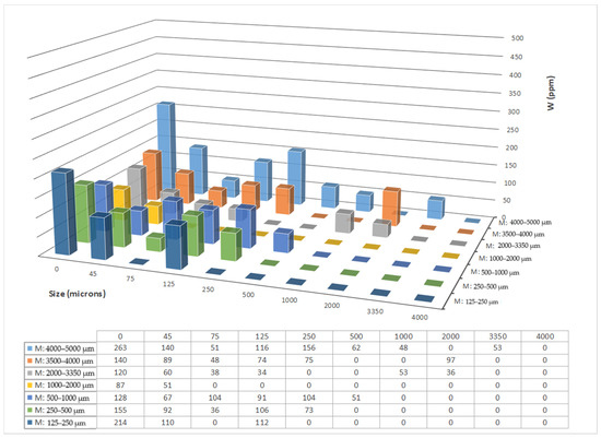 As can be seen in Figure 8, Figure 9 and Figure 10, for most monosizes, W content increased with decreasing particle size. This could be partly explained because feed grain sizes around 250 µm already yielded higher W content, as shown in Table 2. Nevertheless, maximum values after grinding were 6–7 times higher than original values pointing undoubtedly to a differential grinding effect leading to W mineral grains mainly falling in the 250–125 µm interval. The accumulation of these W-enriched particles, which were more difficult to grind, supports the mineralogical explanation of the aforementioned breakage probability reduction at 250 µm size. In addition, this interval always presented Si values higher than the coarser and finer intervals. This would suggest that particles of this size would have a higher probability of fracture compared to the adjacent size intervals. Indeed, in all cases, a decrease in W content could be observed down to 75 µm size, followed by an increase of further finer particles. It must be highlighted that the highest W content was yielded for grinding at 70% Nc. This could be explained because, under these grinding conditions, the mill performance was more efficient due to a more adequate charge regime (Fr close to 0.5), leading to better grinding kinetics.