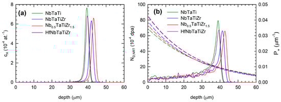 Figure 6 shows the results of the simulation of proton irradiation using the SRIM code [81]. The depth profile of implanted H+ ions is plotted in Figure 6a, while Figure 6b shows the concentration profile of irradiation-induced vacancies calculated using the NRT model [22,23]. From inspection of Figure 6a, one can conclude that the peak of the concentration of H+ ions is located in the depth of 35–45 µm for the alloys studied. The region modified by irradiation extends from the surface up to the depth of 40–48 µm with the peak damage located in the similar depth as that of the maximum concentration of H+ ions (see Figure 6b).