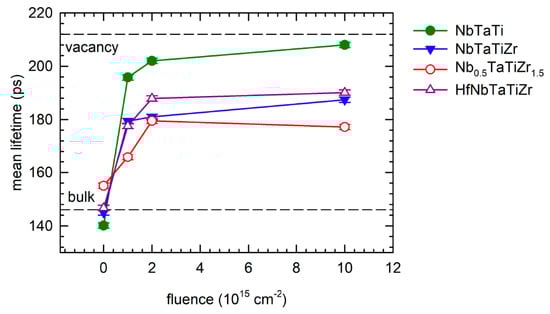 Figure 8 shows the development of the mean positron lifetime with increasing irradiation fluence. The mean positron lifetime is a robust parameter, which is only slightly affected by correlations between the fitting parameters. It is useful for observation of trends occurring during irradiation. The virgin samples exhibit single component LT spectra indicating that positrons are annihilated in a single state. The virgin state of the alloys studied is characterized by the lifetime in the range of 140–155 ps corresponding to the bulk lifetime, i.e., the lifetime of free positrons not trapped at defects [87]. Hence, the concentration of defects in these alloys is very low and virtually all positrons are annihilated in the free state.