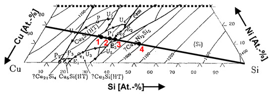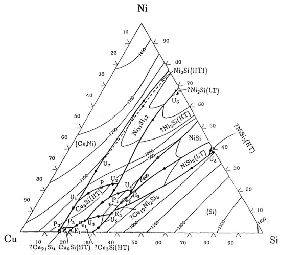 A review of the published information on the three-component system copper–nickel–silicon [13] shows that ternary intermetallic phases were not found in all cases. From the few available data, it can be concluded that the nickel silicides have a solubility for copper and the copper silicides for nickel. The sections Cu-Ni 2 Si, Cu-Ni 3 Si, Cu-NiSi, Cu 3 Si-Ni 3 Si, Cu 3 Si-NiSi are not quasibinary, as at least one true intermetallic phase (Cu 12 Ni 2 Si 5 ) is formed. The resulting liquidus projection results is shown in Figure 1 [13,14].