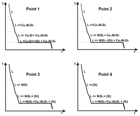 At points 1 and 2, a primary crystallization of Cu 12 Ni 2 Si 5 is expected, while at points 3 and 4, a primary crystallization of NiSi 2 and Si occurs, respectively. In the following, the expected cooling curves for the maximum and minimum silicon turnover are shown in a highly simplified form (Figure 3, points 1 and 4). Points 2 and 3 show compositions for which a significant change in the cooling curve and thus in the microstructure is to be expected. The resulting phases are Si, Cu 12 Ni 2 Si 5 , NiSi 2 , and Cu 3 Si.
