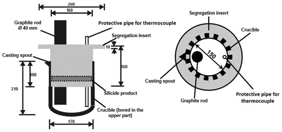 After the silicon particles had dissolved in the melt under stirring (both inductive and mechanical), the formed dross was removed and the melt was poured for segregation into a crucible equipped with the graphite insert, preheated to 1200 C in a muffle furnace. After the metal was poured, a graphite rod ( ϕ 3 cm) was immersed in the melt.