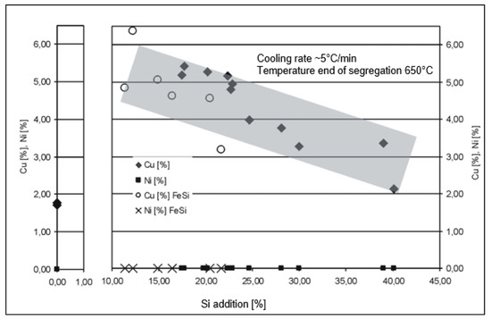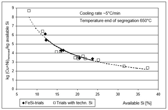 Figure 5 shows that nickel is always almost completely removed, whereby the residual contents are independent of the silicon addition or the “available” silicon. For the final copper contents achieved, on the other hand, there is a decreasing tendency with increasing “available” silicon quantities.