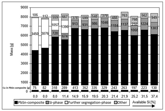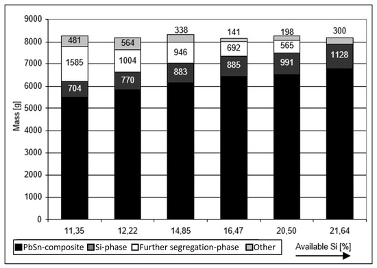 In the tests without precipitation reagent, the amount of the PbSn composite product is significantly lower than in the tests with silicon addition, because the segregation product fills the complete melt volume as a porous “cake” with a high PbSn composite content. The other proportions are dross, sample material, or metallic residues, which will not be considered in detail in the further evaluation.