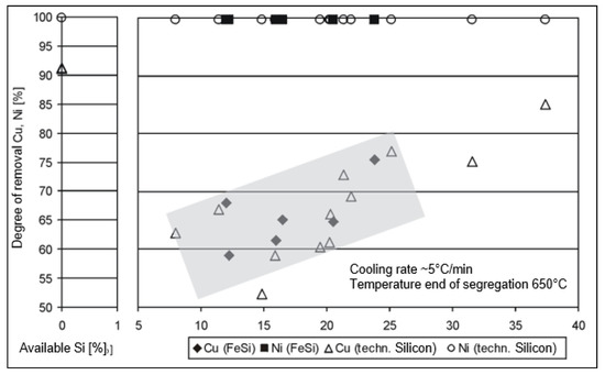 Figure 9 shows that by increasing the silicon or FeSi rate, the degree of removal can be increased from about 55% copper to up to 85% copper. More than 90% copper can be removed by silicon-free segregation, but as mentioned above, with massive lead–tin losses (Figure 11). Nickel is completely removed in all cases.