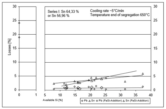 Figure 11 shows the losses of lead and tin in the segregation or silicide product in relation to the flow. Lead losses are constantly below 1.5%, while tin losses increase from about 2 to 5% with increasing silicon addition. At over 20%, lead losses are significantly higher by a factor of 10 to 15, and tin losses of over 50% are significantly higher when segregating without silicon addition, and do not allow this method for an economical refining of the raw PbSn composite.