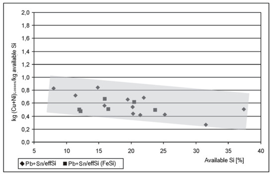Figure 10 illustrates that the values of Si effectiveness (calculated by Equation (3)), i.e., the copper and nickel contents removed from the PbSn composite per kg of “available” silicon, decrease significantly with increasing silicon addition or “available” silicon.