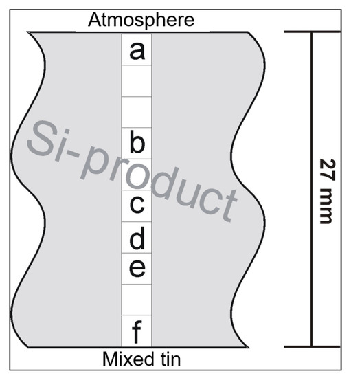 In the SEM, several samples from the upper edge (phase boundary silicide product–atmosphere) to the lower edge (phase boundary silicide product–PbSn composite) were scanned and the occurring phases were examined for their composition. The following drawing (Figure 13) shows the locations where the samples were taken from the silicide product and the position of the selected images.