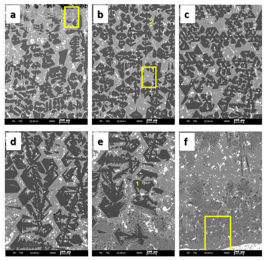 Figure 14. SEM images of the silicide product (subfigure (a) is from the phase boundary between silicide product and atmosphere, and subfigure (f) is from the phase boundary between silicide product and PbSn composite. Subfigures from (be) refers to the silicide product. The rectangles indicates the location of the partial sections seen in Figure 15.