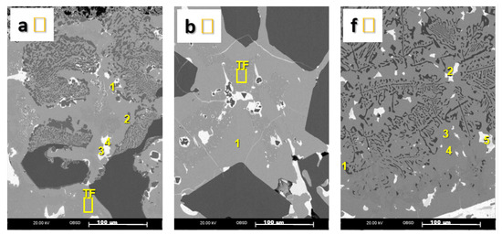 Figure 14 shows the SEM images of each analyzed section. Further analysis were made in the regions within the marked square for the sections a, b, and f. These are illustrated in Figure 15.