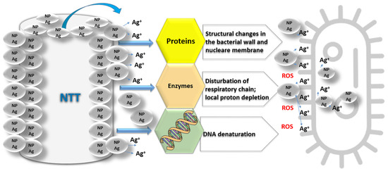 Silver ions can inhibit several enzymes, the passage of the succinate into the cell, disrupt respiratory chain (in E. coli), accelerate the generation of ROS, inhibit cell signaling, inhibit protein synthesis, and inhibit the production metabolites efflux [57,58,59]. TiO2 nanoparticles can create more ROS, and the energy created on the surface is higher than NTT’s. ROS can trigger the peroxidation of membrane lipids causing bacterial death [60]. They also generate intracellular oxidative stress, damage to the cell membrane, and irreversible DNA structure changes [61].