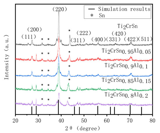 Figure 1 shows the XRD analysis spectrum of the Ti2CrSn1−xAlx (x = 0, 0.05, 0.1, 0.15, 0.2) series of alloys. As can be seen in Figure 1, after melting and annealing, the observed structure of Ti2CrSn1−xAlx is in general agreement with the Ti2CrSn diffraction peaks of the full-Heusler structure obtained using CrystalMaker calculations. CrystalMaker simulation calculation is based on the cubic crystal system, Fm-3m space group, and lattice constant of 6.56 Å. The material model is created and the powder diffraction peak of the Ti2CrSn sample is obtained. This indicates that full-Heusler structure alloy materials were indeed obtained. As the Al content increases, the diffraction peaks on the crystalline surface of the samples gradually shift towards a higher angle due to the smaller atomic radius of Al (1.43 Å) compared to that of Sn (1.58 Å). In the Al doping range of 0–0.2, as the amount of Al substitution gradually increases, the lattice constant of the material decreases, resulting in a rightward shift of the diffraction peaks. However, the structure does not change, and remains a cubic crystal system with the Fm-3m space group. The peak of singlet Sn, observed in the XRD diffraction peaks of the prepared samples (marked with ‘*’), is due to the material’s low melting point, which causes its precipitation during the melting phase. Yin M and Nash P [25] also precipitated monomer Ru with a low melting point in the experiments synthesizing the full-Heusler alloy Ru2TiSn.