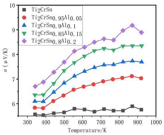 A graph of the Seebeck coefficients of the samples in response to temperature is displayed in Figure 3. As the graph illustrates, the Seebeck coefficients of the samples are all positive in the tested temperature range, with p-type semiconductor conductivity characteristics. On aggregate, this indicates that the material’s thermoelectric transport is mainly dominated by holes. The Seebeck coefficient increases significantly with the increasing Al content, due to the large concentration of ionised impurities in the material, and their contribution to the scattering factor as the extent of doping increases. When the scattering caused by ionised impurities is enhanced, the carrier (electron or hole) mobility decreases, but the value of the Seebeck coefficient increases dramatically. Coefficient α increases with temperature for all samples in the temperature range 373 to 873 K. When the temperature reaches the intrinsic excitation temperature (873 K), the Seebeck coefficient of Ti2CrSn0.8Al0.2 reaches a maximum value of 9.18 μV/K, which is approximately 3 μV/K higher than that of Fe2TiSn [27] in the medium-to-high-temperature region (at 873 K, ~3 μV/K), and close to that of Fe2VAl [19] (15 μV/K at 750 K). This suggests that Ti2CrSn0.8Al0.2 has some potential application in the medium-to-high-temperature region. This variant of the alloy also exhibits a high Seebeck coefficient due to the increased concentration of ionised impurities after Al doping, leading to enhanced scattering which, in turn, results in higher Seebeck coefficients. In addition, as Figure 3 shows, upon reaching the intrinsic excitation temperature, the value of α demonstrates saturation—or even a decreasing trend—with increasing temperature. This is because the concentration of minority carriers inside the sample increases after intrinsic excitation, increasing the chance of it compounding with the majority carriers. The material then becomes a semiconductor with predominantly intrinsic carrier conductivity, thus leading to a sharp decrease in α.