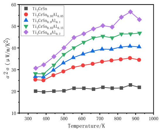 Power factor variation curve with temperature for the Ti2CrSn1−xAlx (x = 0, 0.05, 0.1, 0.15, 0.2) alloy.