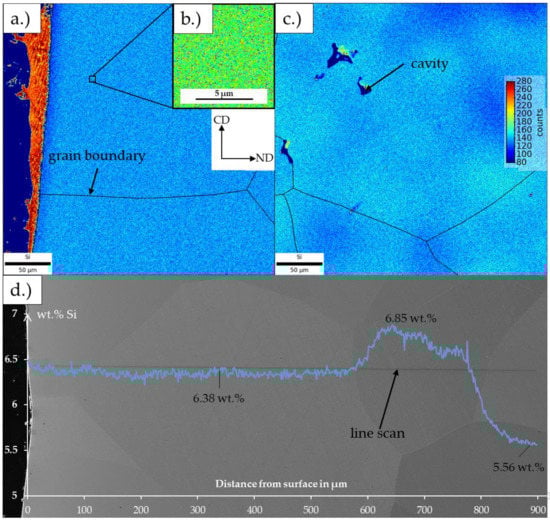 - With the aid of the EPMA measurements, a largely homogeneous Si distribution was measured over 70% of the cross-section of the strip. Furthermore, no dendritic solidification could be observed. Nevertheless, microsegregations occur, especially in the center of the strip with maximum measured Si contents of 6.85 wt.%.